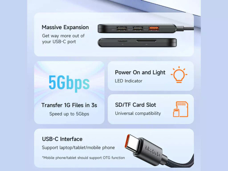 استفاده از هاب Mcdodo HU-143 5in1 USB-C به راحتی شما شما را قادر خواهد کرد قابلیت های رایانه خود را به سرعت یک چشم بر همزدن افزایش دهید. این ایستگاه اتصال دارای 5 درگاه اتصال از جمله USB2.0 x 2, USB3.0 x 1, SD Card Slot, TF Card Slot می باشد که از کارت حافظه و هارد دیسک اکسترنال تا ظرفیت 2 ترابایت پشتیبانی می کند. همچنین با انواع سیستم عامل ها کاملاً سازگار است و طراحی جمع و جور و وزن کم آن باعث می شود بسیار قابل حمل باشد.