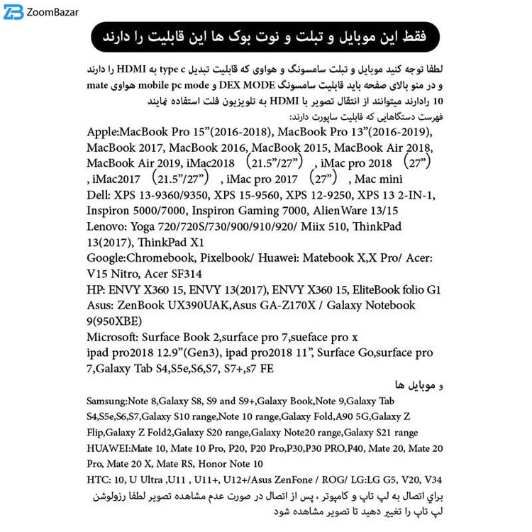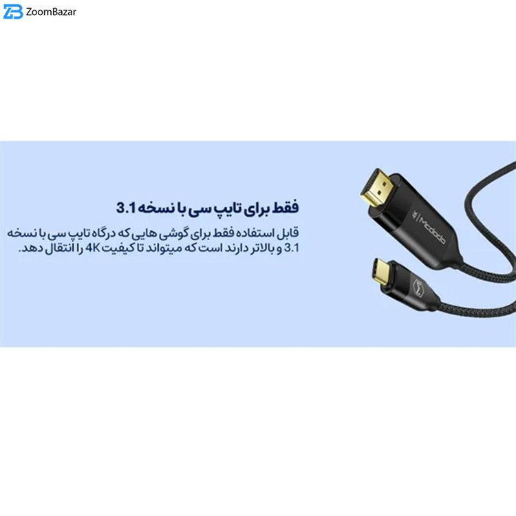 کابل تبدیل USB-C به HDMI مک دودو مدل CA-5880 طول 2 متر( لطفا توجه کنید) برای انتقال تصویر از موبایل های سامسونگ سری S و مک بوک و هواوی و نوت بوک و تبلت هایست که دارای پورت تایپ سی USB-C 3.1 هستند و قابلیت انتقال تصویر را دارند مانند سامسونگ S8/S9/S10/S20/S21/S22 ULTRA/NOTE9/NOTE10/NOTE20 یا هواوی P20,P30,P40,MATE10 و مک بوک های 2016/2017/2018/2019/2020/2021/2022 . این کابل از کیفیت 4K 60Htz پشتیبانی میکند و دارای سوکت هایی مقاوم با روکش آلیاژ طلا بوده و جنس کابل کنفی و مقاوم می باشد.این کابل علاوه بر امکان استفاده قابلیت DEX سامسونگ از کیفیت 4K ULTRA HD 60Htz پشتیبانی می نماید و دارای چیپ رمزگشای HDR میباشد.در تصاویر فهرست موبایل و تبلت و لپ تاپ هایی که قابلیت ارسال تصویر با کابل را دارند، قرار داده شده است.برای انتقال تصویر موبایل های شیائومی و سامسونگ سری A,M,F,J مانند َA73 ,F22 و سری poco , note شیایومی و سری lite موبایل ها و تبلت ها نمیباشد.